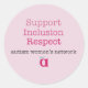 Image hat den Text in einem Schriftart für Schreibmaschinen: "Unterstützung / Inklusion / Respekt" in rosa Farbabstufungen; "Autismus Frauennetzwerk" in schwarz; und unten ist das AWN Logo.