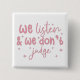 Beschreibung: Eine warme und unterstützende Nachricht in einem spielerischen, handgeschriebenen rosa Schriftart mit kleinen Glitzern. Der Satz "Wir hören zu und wir beurteilen nicht" fördert Freundlichkeit, Verständnis und eine urteilsfreie Einstellung.
