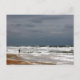 Ein Mann steht am Rande der Wellen, der an einem stürmischen Morgen angeln will.