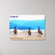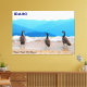 Drei kanadische Gänse (Branta canadensis) planen, sich in den ankommenden Surf am Ufer des Pend Oreille-Sees am Sandpoint, ID auszubreiten; die blauen Berge liegen in der Ferne. Anpassbare Textauswertung, "IDAHO" wird ebenfalls angezeigt. Passen Sie Ihren eigenen Text an.