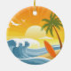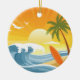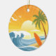 Rundes Design einer Strandlandschaft mit einer kleinen Insel, die eine Palme hat, und einem Surfbrett, das vom Sand aufsteigt, umgeben von blauen Wellen unter der Sonnenuntergang.