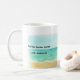 Diese Tasse zeigt ein digitales Aquarelldesign aus Surf, Sand und einer Palme, ergänzt durch den Slogan "Kaffee schmeckt besser mit Meeresluft." Als Vorlage ist es leicht anpassbar für personalisierte Touchs. Das AI-Kunstwerk wurde von Susang6 erstellt.