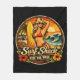 This retro inspired design captures vintage California surf shack energy with a blonde pin-up surfer clutching her surfboard, waves crashing onto the beach, with an antique van in the background. The ride the wave motto, paired with tropical hibiscus flowers complete the salty coastal sunset scene. This soft and cozy black fleece throw blanket will make a fun addition to your beach house decor. | Matching throw pillow available in store.