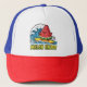 Eine glückliche Wassermelone-Scheibe reitet die Wellen auf einem Surfbrett und bringt Sommerspass und fruchtige Atmosphäre