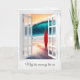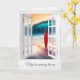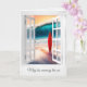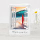 Offenes, weißes Fenster mit Vorhängen und aufrecht orangefarbenem Surfbrett im Sand des Strandes für das allgemeine Beileid. Alle Texte können geändert werden.