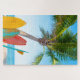 Das Design umfasst farbenfrohe Surfbretter, die im Sand mit Palmen, Strand und Ozean im Hintergrund stehend sind. #puzzle #puzzles #surf #surfer #fun #cool #beach #tropical #sport #relax #surfing #games #surfing #gift #gifts #stockingstopffers #secretsanta #christmas