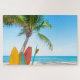 Das Design umfasst farbenfrohe Surfbretter, die im Sand mit Palmen, Strand und Ozean im Hintergrund stehend sind. #surf #surfer #fun #cool #beach #tropical #sport #relax #surfing #puzzles #games #surfing