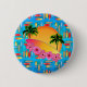 Surfende Grafik mit Surfbrett, Palmen, zacken Hibiskus-Blumen und Sonnenuntergang aus.
