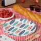 Surfbretter für Surfbretter am rosa Retro-Strand P Pappteller