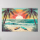 Retro Poster Druck von Surfbrettern am Strand mit dem Sonnenuntergang im Hintergrund. Generative Inhalte