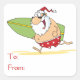 Auf diesem Aufkleber befindet sich ein dicker Weihnachtsmann mit einem Surfbrett am Strand und der Text "nach" und "von", der als Geschenketikett verwendet werden soll.