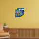Hochwertige Grafik einer Surfszene im Pop-Art-Stil, mit einem Surfer mit kühnen Konturen und flachen, hellen Farben, die auf einer stilisierten Welle reiten.