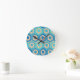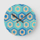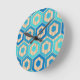Diese Uhr hat ein geometrisches Design von Sechsecken in vier Blautönen auf einem Feld von bräunlichen Streifen in zwei Tönen.