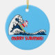 Fröhliche surfmas! Lustige surfende Sankt, die eine große Welle fängt und Ihnen frohen Weihnachten wünscht. Coole und humorvolle surfende Sankt-Weihnachtsgeschenkverzierungen, zum des Feiertag Weihnachtsbaums zu verzieren.