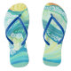 Weiche Blues und Gelb, ein cooles Paar Sommerhausschuhe. Zwei Wasserfarbenwellen brechen spielerisch am Ufer auf.