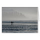 Zwei Surfer gehen nach draußen, um das Wasser des Abends von Wickaninnish Beach zu testen, während der Pazifiknebel vom Wasser kommt.