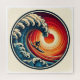 Mit diesem lebendigen, kreisförmigen Kunstwerk mit einer kühlen Welle unter einem feurigen Sonnenuntergang erleben Sie den Nervenkitzel des Ozeans. Das Design präsentiert einen waghalsigen Surfer, der gegen das dramatische Zusammenspiel von warmen Orangen und Rottönen im Himmel schweift und nahtlos mit der coolen Blues des Wassers vermischt. Ideal für diejenigen, die Abenteuer, Freiheit und die raue Schönheit der Natur lieben, strahlt dieses Stück Energie und Bewegung aus. Ideal für Bekleidung, Dekoration oder Accessoires.