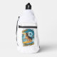 Ein kluger, niedlicher und lustiger deutscher Schäferhund fährt auf einem Surfbrett in einer riesigen Welle in einer tropischen Insellandschaft.