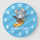 A surfing polar bear on a wall clock. Use "Edit this design" to change the "PARTY TIME!" text and create a unique, customized item. A fun wall clock featuring an ice cool polar bear in sunglasses and Hawaiian shirt, chilling on a surf board with hand held fan and cold drink. An image to remind you of summer, sunshine and relaxing holidays.