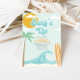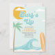 Surft nach oben! Surfstrand Geburtstag laden mit türkisfarbenen Wellen und Orangensurfbrett ein.