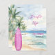Eine Einladung zu einer Geburtstagsfeier am Strand für ein Mädchen. Ein Strand mit feinem Sand, Meereswellen und Palmen als Hintergrund und ein rosa Surfbrett am Strand. 1 Blatt = 1 Einladung mit Druckkante bis Kante.