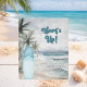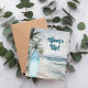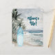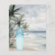 Eine Einladung zu einer Retro-Beachgeburtstagsfeier. Ein Strand mit feinem Sand, Meereswellen und Palmen als Hintergrund und ein blaues Surfbrett am Strand. 1 Blatt = 1 Einladung mit Druckkante bis Kante.