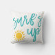 Entspannen Sie sich in Ihrem Strandhaus, im Innenhof oder im Poolbereich mit unserem sommerlichen Kissen im Außenbereich! Das niedliche Zitat-Design zeigt "surf's up" in lebendiger aquamariner handgeschriebener tropischer Typografie mit hellgelber Sonnenstudio. Das Kissen kehrt zu türkisfarbenen und weißen Streifen zurück.