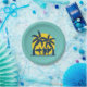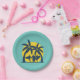 Niedliche Grafik der Strandszene mit Palmen, Surfern und der Sonne. Ideal für Surfer.