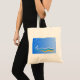 © Sunny Mars Designs - Surf Abstrakt Budget Tote Bag - Diese coole Blau-Weiß-Surf individuelle Tasche bietet eine weiße Silhouette eines Surfers, der auf einer Welle surft, mit Möwen, die oben auf einem blauen Hintergrund fliegen.