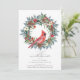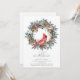 An elegant red cardinal nestled in a winter greenery wreath invites guests to your winter or Christmas birthday party. The watercolor design features a beautiful cardinal and a pine wreath decorated with red flowers and berries along with pine cones.