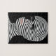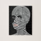 Die künstliche KI erzeugte Kunst eines surrealen Gesichts mit schwarz-weißen Streifen und natürlichen Farblippen