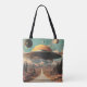 Surreal landscape with a desert road leading towards mountains, with a large UFO hovering above. Several planets are visible in the sky, including one with rings. The foreground features desert vegetation and trees. The overall color palette is warm, with browns, oranges, and blues dominating the scene. The image has a dreamlike, otherworldly atmosphere.