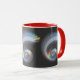 Eine Tasse eingewickelt in einem Entwurf der surreal metallischen Fossilien, die ein großes Geschenk für einen Besucher zur Juraküste machen würden oder des jedermann, das die gehende versteinerte Jagd in irgendeinem Teil der Welt mag. Obgleich sie nicht Ammoniten wie diese im Entwurf oben durchaus graben werden.