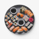 Papier Party Teller mit verschiedenen Sushi-Typen vor grauem Hintergrund.