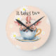 Süß "Es braucht Zwei" Teetassen-Ferkel-Design-Rund Uhr mit süßen Zwillingsferkeln in einer Teetasse auf weißer floraler Daisy- und gelbem Hintergrund.