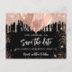 Ein schwarzer Hintergrund mit Rosetten, vergoldete Rose-Imitate Glitzer Tropfen, Glitzern und Ballons. Personalisieren und fügen Sie Datum und Name/Alter hinzu. Der Text: Save the Date ist mit einem großen angesagten, handgeschriebenen Stilskript geschrieben.