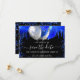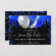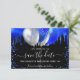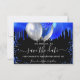 Schwarzer Hintergrund mit königsblauen Tropfen, Konfetti und Ballons. Personalisieren und fügen Sie Datum und Name/Alter hinzu. Der Text: Save the Date ist mit einem großen angesagten, handgeschriebenen Stilskript geschrieben.