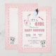Eine charmante Sammlung von Babyparty-Einladungen für Mädchen mit einem lustigen Storch. Diese schöne Sammlung ist speziell für Babymädchen entworfen. Mit rosa Tönen, modernen Illustrationen und sauberen Designs. Perfekt, um die Ankunft eines Babys mit Stil und Einfachheit zu feiern. Perfekt für stilvolle Eltern, die zeitgenössisches Design und einfache Eleganz lieben.