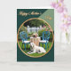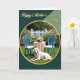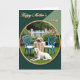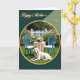 Dieses Design zeigt eine ruhige Gartenszene in einem goldenen, runden Rahmen, der vor einem Hintergrund platziert ist, der zwischen einem tiefen Waldgrün und sanfteren Olivtönen geteilt ist. Oben erscheint eine festliche Botschaft in fließender goldener Schrift, zentriert und leicht zu erkennen. Im Vordergrund liegt ein cremefarbener Hund auf üppigem grünem Gras, seine entspannte Haltung verstärkt die sanfte und liebevolle Stimmung. Hinter dem Hund steht ein kleiner Tisch, bedeckt mit einem pfirsichfarbenen Tuch, auf dem ein rustikaler Korb mit pastellfarbenen Rosen in blassem Rosa, cremigem Weiß und sanftem Gelb steht 🌼. Zwei blaue Gartenstühle mit geschwungenen Metalldetails und hellen cremefarbenen Kissen sitzen auf beiden Seiten, nach innen geneigt, als wären sie für ein ruhiges Gespräch zwischen engen Freunden aufgestellt ❤️. Weiter hinten verläuft ein weißer Lattenzaun quer durch die Szene, hinter dem