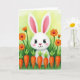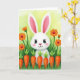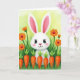 Diese Karte zeigt ein stilisiertes weißes Kaninchen, das hinter einem dicken Büschel smaragdgrünem Gras hervorschaut, wobei sein Gesicht und Oberkörper zentriert sind, als ob es sich zum freundlichen Gruß vorbeugt 🐰. Davor bilden sieben ordentlich aufgereihte orangefarbene Wurzelgemüse mit grünen Blättern eine ordentliche kleine Gartenreihe, die sich wie ein gemeinsamer Moment zwischen dem Kaninchen und dem Betrachter anfühlt. Die großen blauen Augen des Kaninchens, seine winzige rosa Nase und rosigen Wangen verleihen ihm einen zarten, liebevollen Ausdruck, als ob es sich still freut, jemanden Besonderes zu sehen. Hohe Ohren ragen über seinen Kopf hinaus mit weichen rosa Innenflächen, was der Szene eine sanfte, gemütliche Note verleiht. Der Hintergrund verblasst zu einem blassen, sonnendurchfluteten Grün, wodurch der Fokus auf dem Kaninchen und dem Garten bleibt und eine ruhige Frühlingsmorgenstimmung suggeriert wird. Kleine warme orangefarbene Blüten mit sternförmigen Blütenblättern und dunkleren roten Zentren sprenkeln das Grün, wie freudige Noten, die in die Landschaft gesteckt