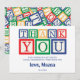 Oh Junge, oh Junge! Erinnerst du dich an die klassischen hölzernen ABC-Blöcke, mit denen du früher gespielt hast? Dieses Design entstand auf einer nostalgischen Reise in die Vergangenheit, bei der man sich an die Freude erinnerte, Türme zu bauen und das Alphabet zu lernen, alles in diesen hellen, primären Farben! Wir haben diesen süßen, vintage Spielzeugkasten-Charme eingefangen, um ein großes, spielerisches "DANKE" zu buchstabieren. Es ist perfekt, um nach einer Geburtstagsfeier, einem Babyshower oder einer kinderfreundlichen Feier eine warme, persönliche Nachricht zu senden. Passe einfach die kleine Nachricht und Unterschrift an, um es zu deinem eigenen zu machen. Es ist nicht nur ein Dankeschön; es ist ein kleines, farbenfrohes Stück Kindheitsfreude!