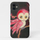 Niedliche, süße rote Eule auf einer Niederlassung mit rosa Blumen. Spaßkunst, die ein großes Geschenk für Kinder, Kinder am Herzen, Eulenliebhaber und Eulensammler machen würde.