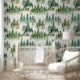 Süße skurrile Tapete bedruckt mit einem einzigartigen handgemalten Wasserfarbenmuster von Waldtieren auf weißem Hintergrund. Lustiges, spielerisches Muster für ein Kinderzimmer oder Spielzimmer. Geschlechtsneutral, großartig für Jungen sowie Mädchen. Nebeliger Wald, grüne Bäume würden auch in einem Erwachsenenschlafzimmer gut aussehen und eine entspannte, ruhige Atmosphäre schaffen. Sie werden es lieben, wenn Sie ein Natur- und Kunstliebhaber sind.