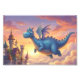 Ein charmanter blauer Drache schwebt friedlich über einem Märchenschloss während eines warmen Sonnenuntergangs. Dieses fantastische Kunstwerk zeigt sanfte Pastellfarben und eine Atmosphäre wie aus einem Bilderbuch, die Magie und Staunen in jeden Raum bringt.