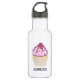 Eine personalisierte Wasserflasche mit einer Illustration eines köstlichen, aussehenden Kuchens. Rosa Zuckerguss und Schokoladentrizzles. Ein gelber Kuchenhalter und eine Himbeere oben. Ja!