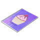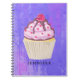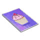 Ein Wendelheft mit einer Illustration eines köstlich aussehenden Kuchens. Rosa Zuckerguss und Schokoladentrizzles. Ein gelber Kuchenhalter und eine Himbeere oben. Ja! Der Hintergrund ist eine lila abstrakte Textur mit kleinen Herzen durchdrungen.