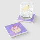 Ein Untersetzer mit einer Illustration eines köstlichen Kuchens. Rosa Zuckerguss und Schokoladentrizzles. Ein gelber Kuchenhalter und eine Himbeere oben. Ja! Der Hintergrund ist eine lila abstrakte Textur mit kleinen Herzen, die um sich gesprenkelt sind.