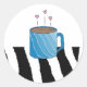 Eine dampfende Tasse Kaffee mit kleinen Herzen auf zebrafarbenem Fell-Hintergrund.