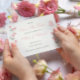 Süßer Erbsen-Blütenkarte Save the Date für die Hochzeit mit pinkfarbenen Blume aus Süßkarpfen auf cremigem Hintergrund