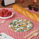 Papiertafel zum Thema Zitrusfrüchte mit wunderschönen handbemalten Orangen und Grünpflanzen, die mit klangvollen Schriftzeichen geschmückt sind.